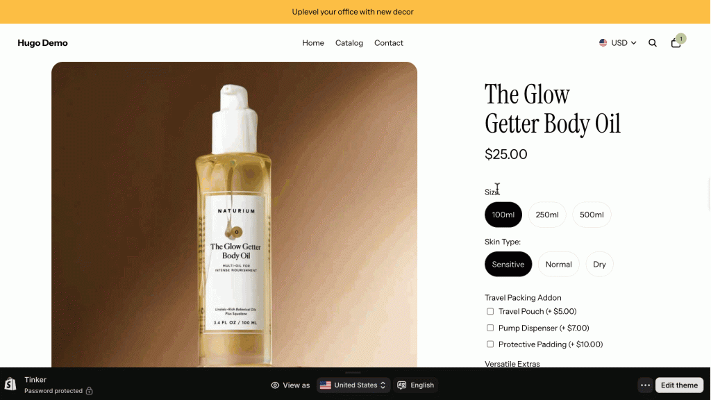 Let’s say you run a body care store selling The Glow Getter Body Oil with multiple variants and attributes.