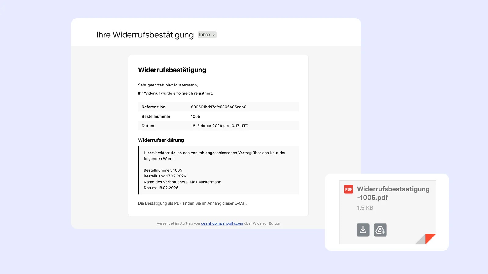 Files are named automatically based on the language used: Widerrufsbestaetigung-{orderNumber}.pdf for German or Withdrawal-Confirmation-{orderNumber}.pdf for English.